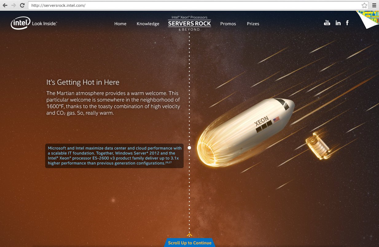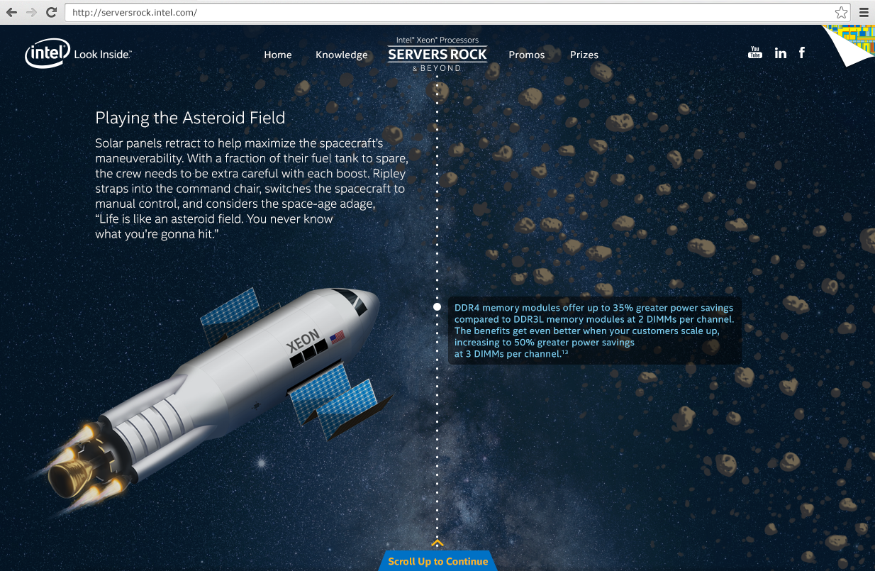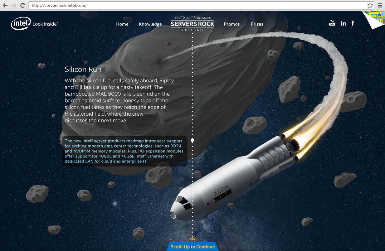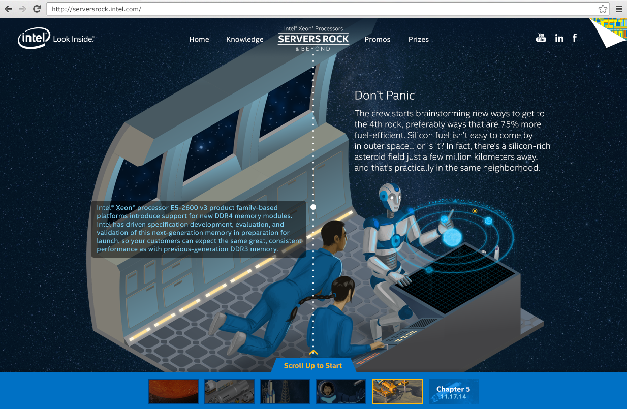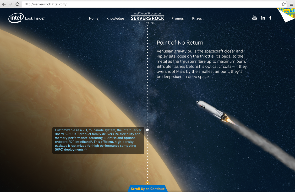 Intel spends a lot educating what it calls “the channel”. This helps distributors and resellers not only know what products to sell but also understand their value and distinction. These trainings have a long history of being creative in their approach. In this execution, I led my agency in creating an interactive story about a crew’s trip to Mars and the various adventures they encountered. Woven throughout were facts and metaphors that would be critical to passing a product-focused quiz. This story-based gamification has long been broadly successful among this audience, with over 50 thousand visitors during this campaign.