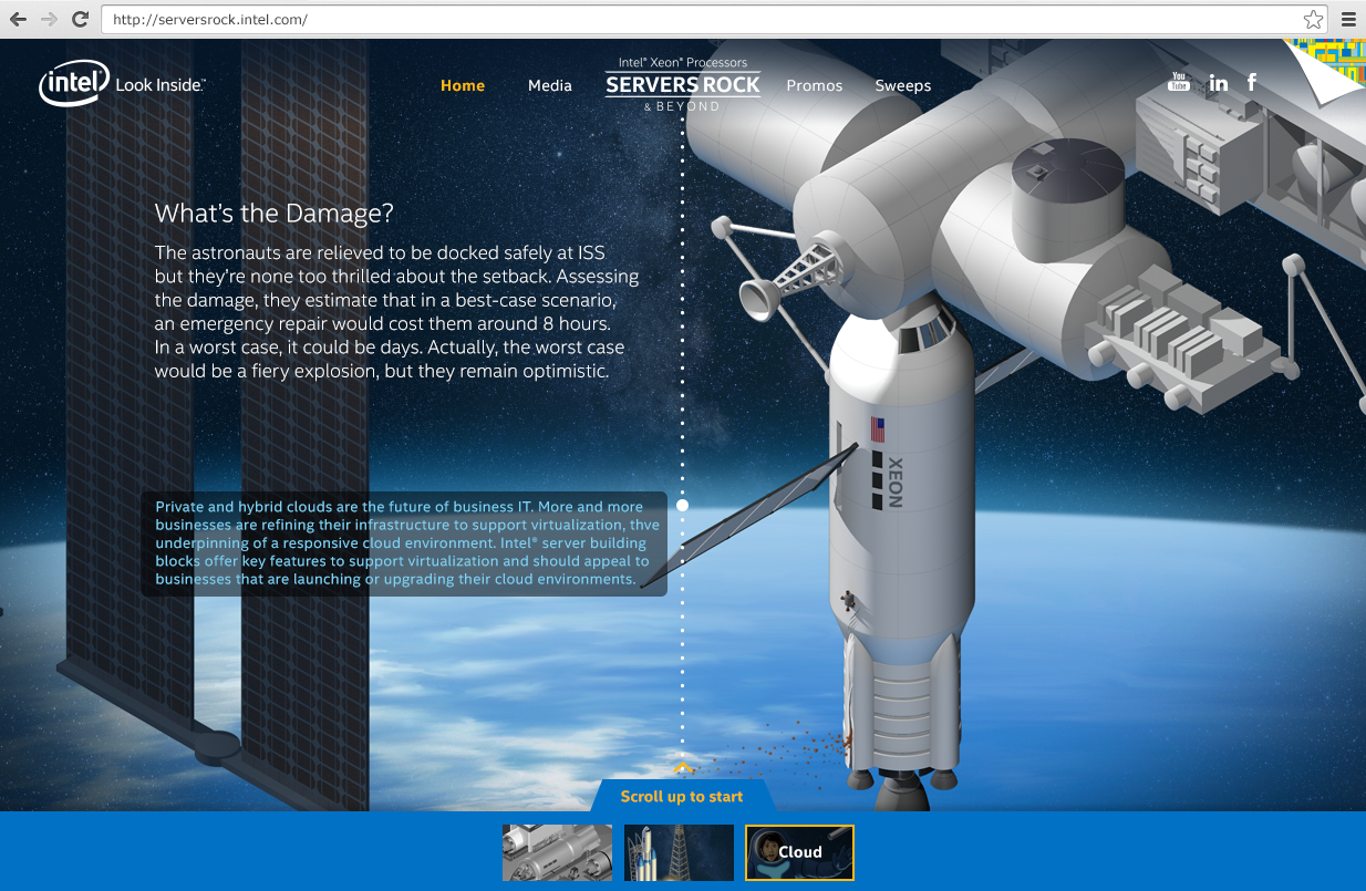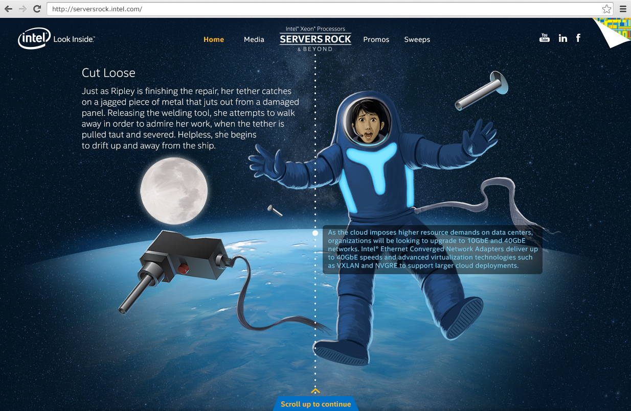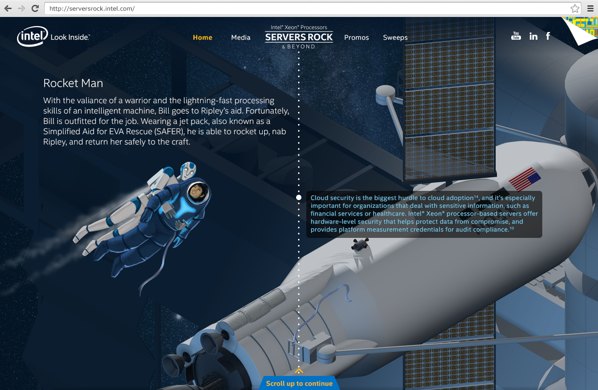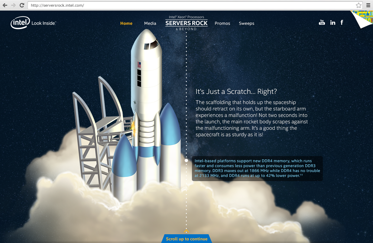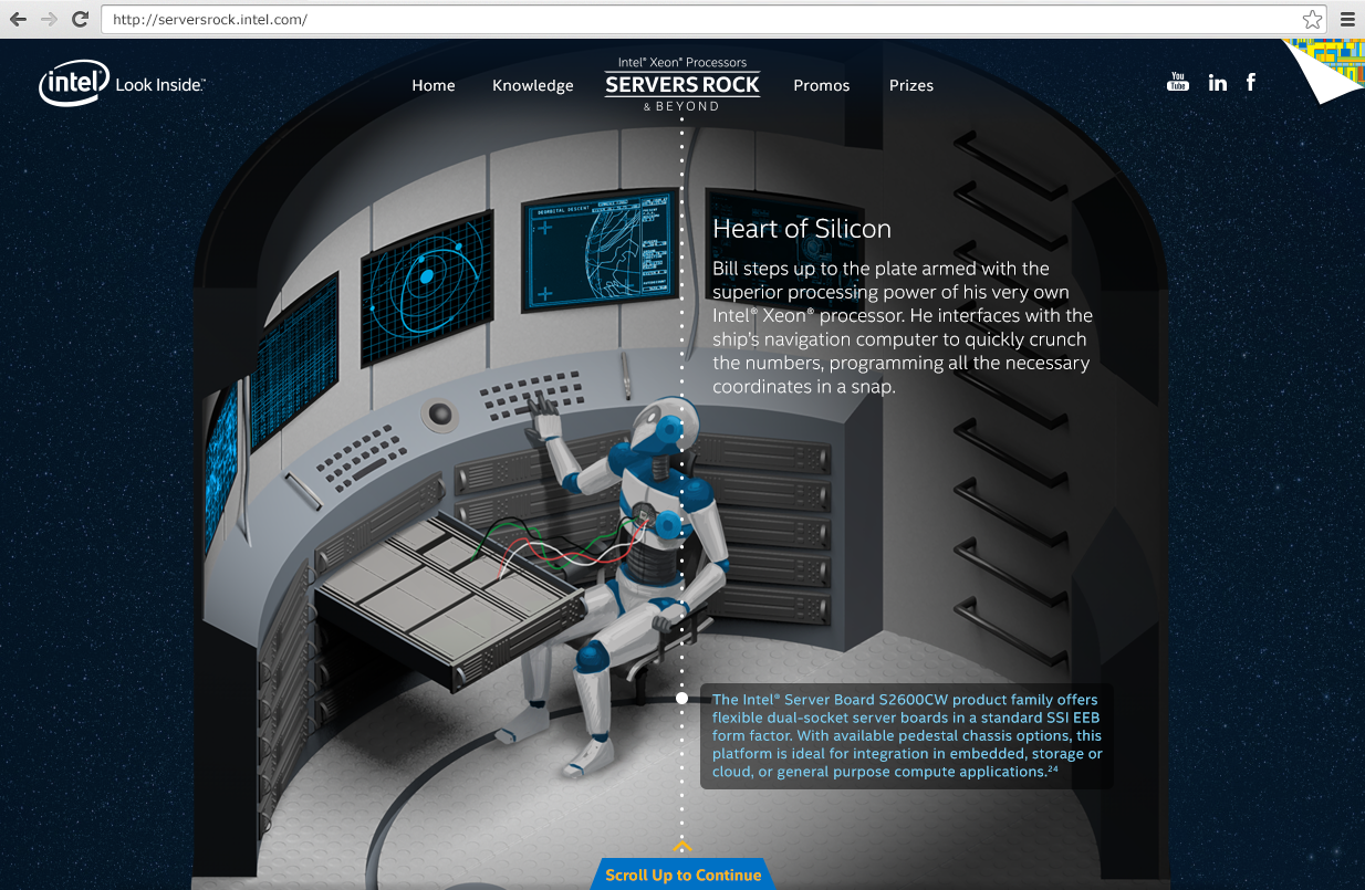 Intel spends a lot educating what it calls “the channel”. This helps distributors and resellers not only know what products to sell but also understand their value and distinction. These trainings have a long history of being creative in their approach. In this execution, I led my agency in creating an interactive story about a crew’s trip to Mars and the various adventures they encountered. Woven throughout were facts and metaphors that would be critical to passing a product-focused quiz. This story-based gamification has long been broadly successful among this audience, with over 50 thousand visitors during this campaign.
